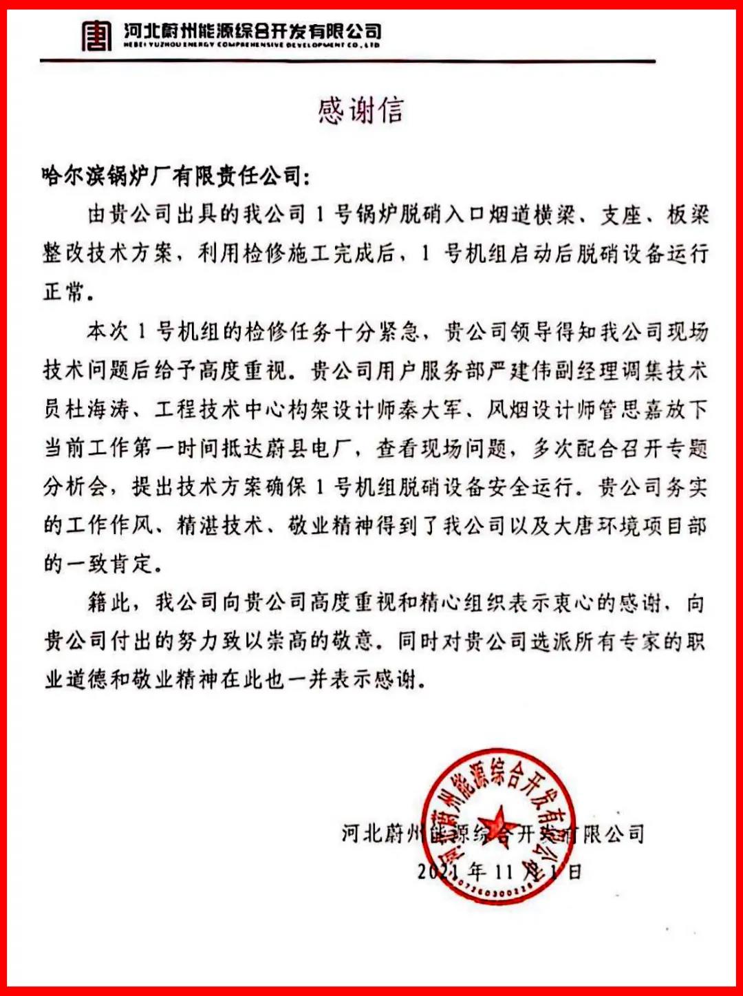 用戶對哈電鍋爐的快速反應及服務代表的敬業(yè)精神和精湛技術表示充分認可和高度贊譽,并特地發(fā)來感謝信對哈電鍋爐提供的工作支持表示衷心感謝。