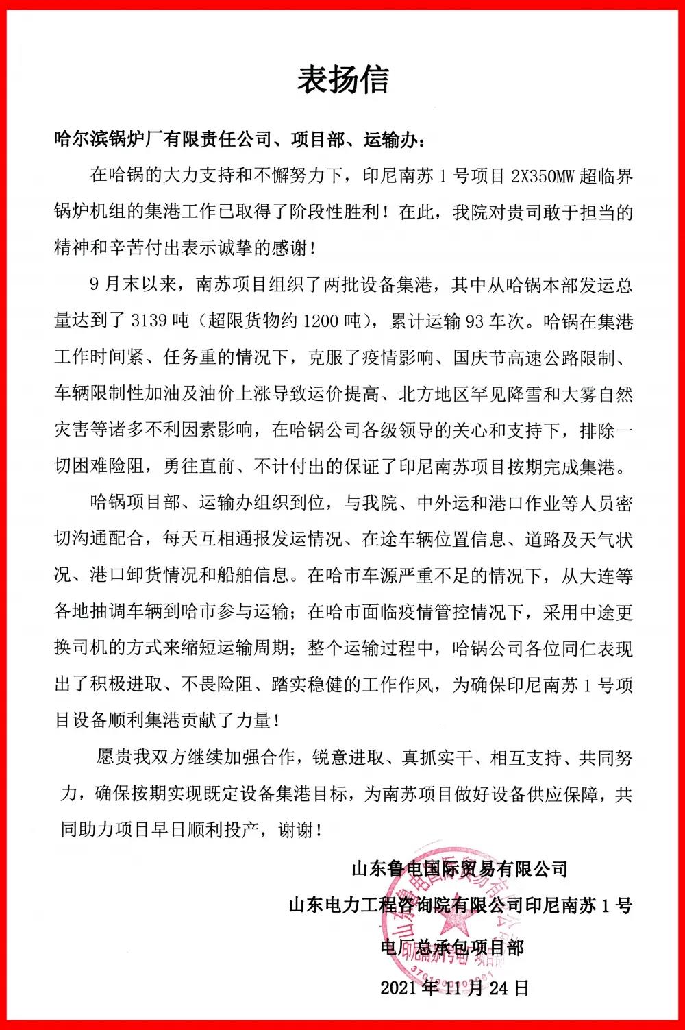 發(fā)布時(shí)間:2021-12-01日前,山東魯電國際貿(mào)易有限公司和山東電力工程咨詢院有限公司印尼南蘇1號電廠總承包項(xiàng)目部聯(lián)名發(fā)來感謝信,對哈電鍋爐在“一帶一路”印尼南蘇項(xiàng)目鍋爐機(jī)組設(shè)備集港[1]中提供的工作支持表示衷心感謝。