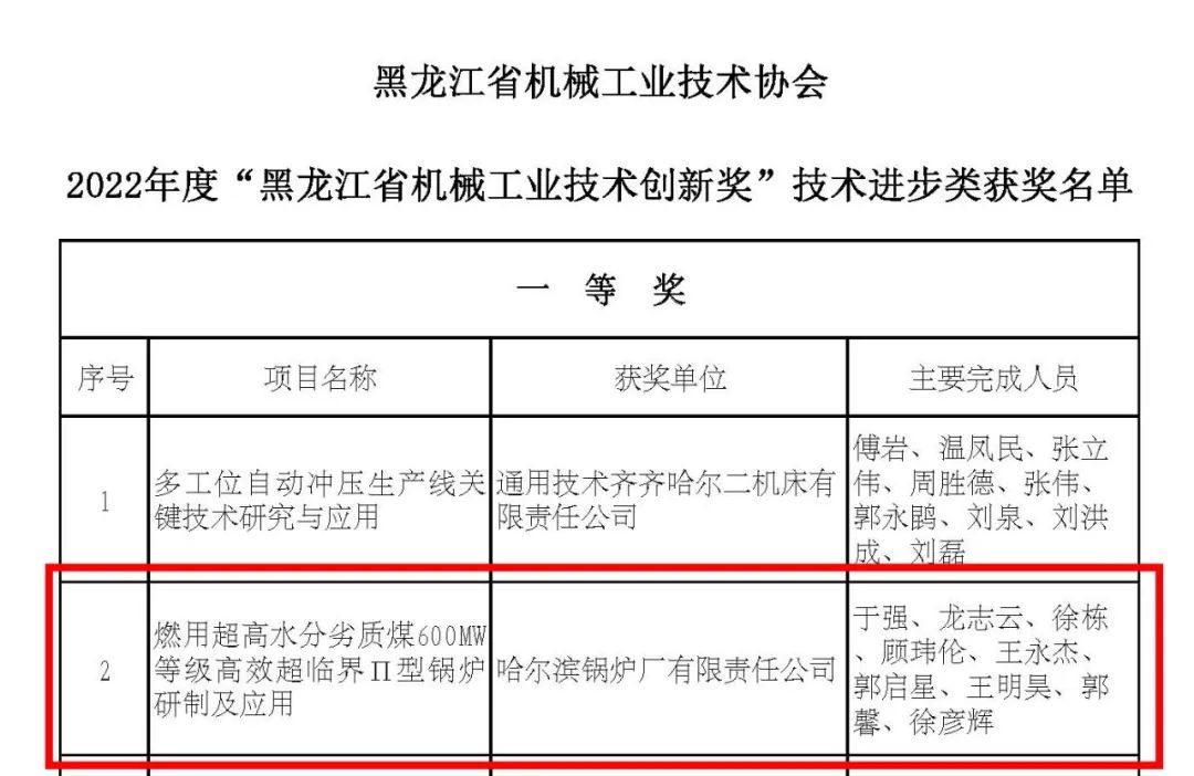 日前,黑龍江省機(jī)械工業(yè)技術(shù)協(xié)會公布了2022年度“黑龍江省機(jī)械工業(yè)技術(shù)創(chuàng)新獎”技術(shù)進(jìn)步類獎項(xiàng)獲獎名單,哈電鍋爐自主研制的“燃用超高水分劣質(zhì)煤600MW等級高效超臨界Π型鍋爐研制及應(yīng)用”項(xiàng)目獲得技術(shù)進(jìn)步一等獎。