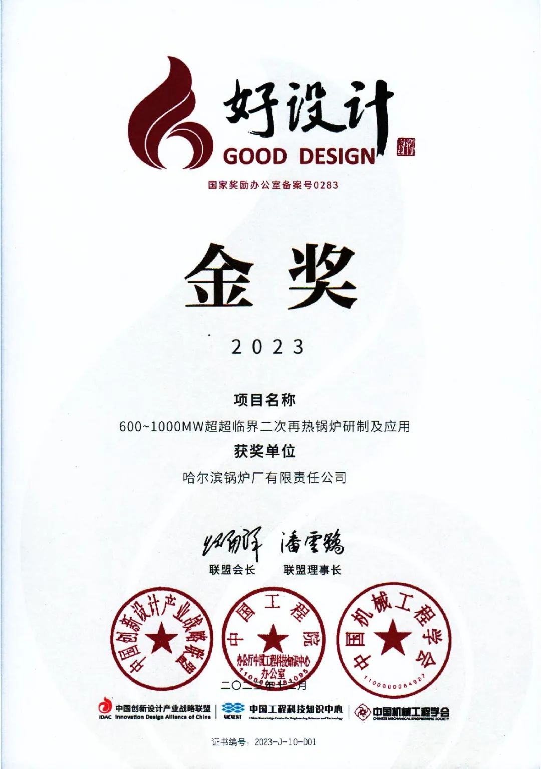 哈電鍋爐研發(fā)的“600-1000MW超超臨界二次再熱鍋爐研制及應(yīng)用”項(xiàng)目榮獲中國好設(shè)計(jì)金獎