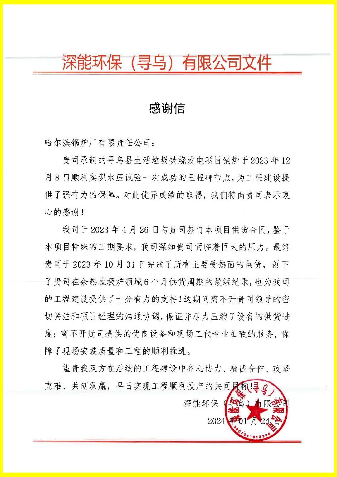 日前,哈電鍋爐研制的深能環(huán)保(尋烏)項(xiàng)目垃圾發(fā)電鍋爐設(shè)備進(jìn)入到關(guān)鍵的調(diào)試環(huán)節(jié),標(biāo)志著項(xiàng)目即將步入試運(yùn)行階段。深圳能源環(huán)保股份有限公司特地發(fā)來(lái)感謝信,對(duì)哈電鍋爐提供的工作支持表示感謝,并表達(dá)了繼續(xù)深化合作的希望。