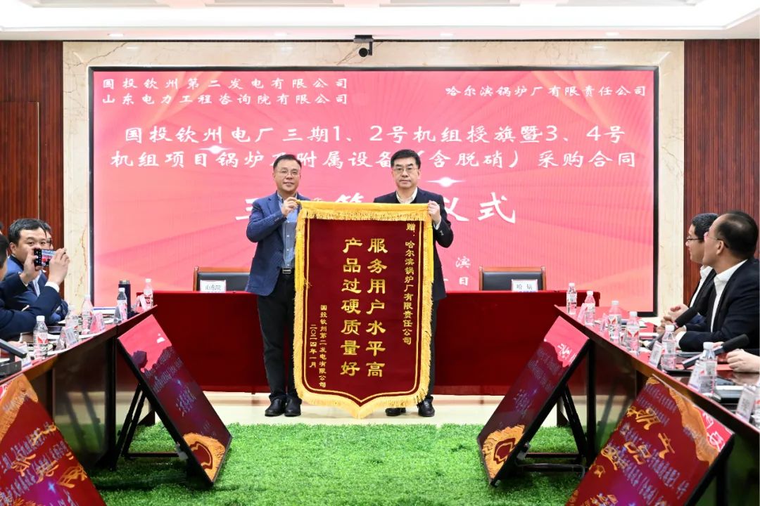 簽字儀式上,宋黎耕、鄭睿、于龍分別代表三方致辭并簽訂合同,劉雁飛主持簽字儀式。國投欽州第二發(fā)電有限公司贈予哈電鍋爐錦旗,對哈電鍋爐此前在國投欽州1號、2號機組項目執(zhí)行過程中的高效履約表示認可。